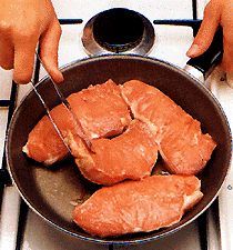 Нагрейте на сковороде оливковое масло. Положите телятину. Поджарьте с обеих сторон до подрумянивания. Переложите на тарелку. Не давайте мясу остыть. Положите на сковороду, в которой жарилось мясо, лук и чеснок и доведите до размягчения. Добавьте томаты, томатную пасту, соль, перец, корицу, орегано и 0,6 стакана воды.