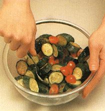 Разогрейте духовку до 220 С. Цуккини нарежьте ломтиками 2,5 см толщиной. Поместите на смазанный оливковым маслом противень и выпекайте в верхней части духовки 20 минут.